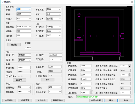 5. 基本参数输入、曳引机厂家选择、门机厂家型号选择、井道尺寸突出物及修井选择、导轨型号选择、轮子型号及数量输入、轿厢等数据的输入。